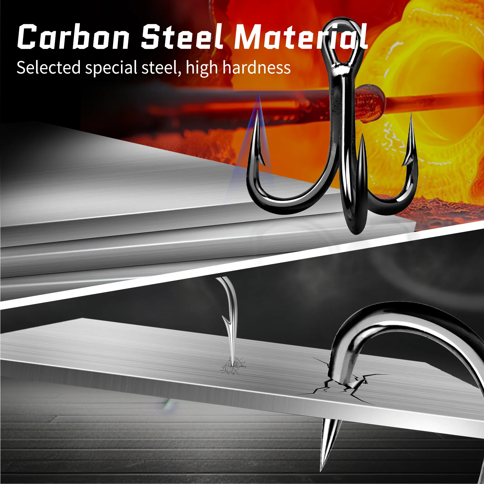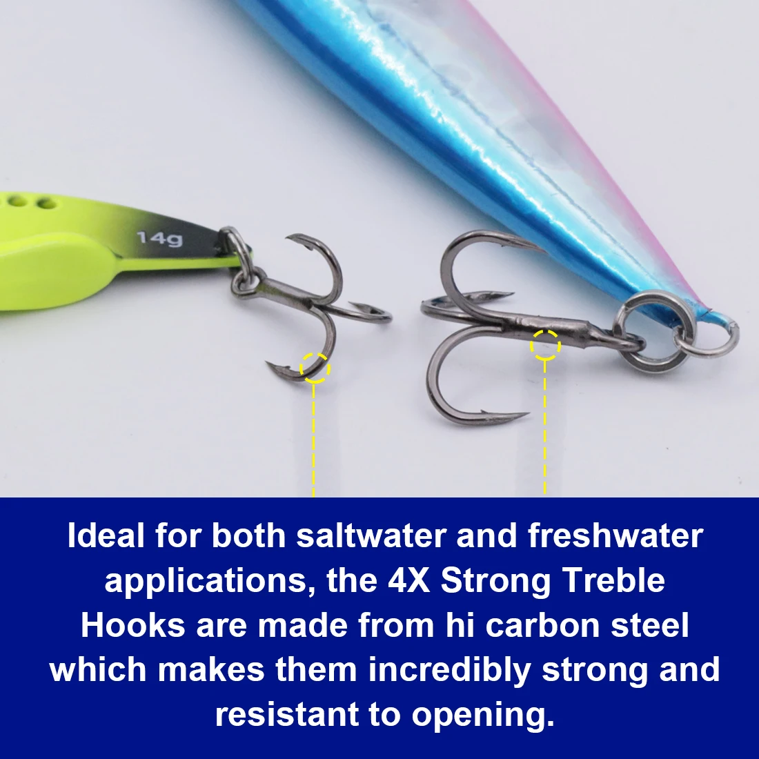 These high carbon steel treble hooks are designed for durability and superior performance. Barbed design ensures secure hooking for a variety of fish species. Ideal for use with hard lures, spoons, jigs, and rigs. Saltwater resistant, making them suitable for both freshwater and saltwater fishing. Sharp points provide excellent penetration for quick and reliable catches. Lightweight yet strong, perfect for precision casting. Easy to attach and replace on your favorite lures. Durable construction ensures long-lasting use in challenging conditions. Suitable for both beginner and experienced anglers. Enhance your fishing setup with these reliable and versatile treble hooks.